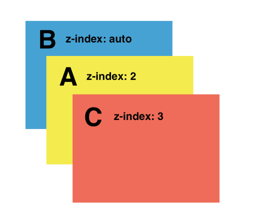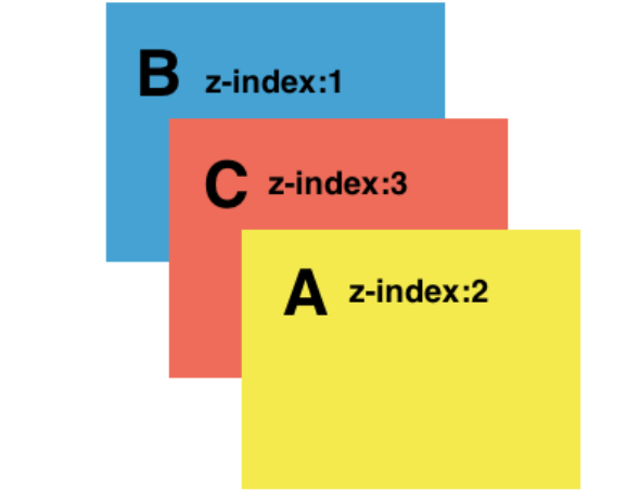 ex) A 는 z-index가 2, B 는 z-index 1, C 는 z-index 3 일 때 A > C > B 순으로 나타난다.